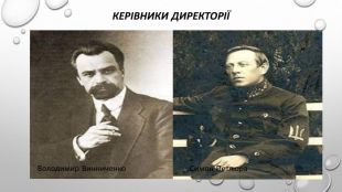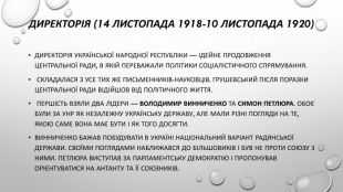 Директорія (14 листопада 1918-10 листопада 1920)Директорія Української народної республіки — ідейне продовження Центральної Ради, в якій переважали політики соціалістичного спрямування. Складалася з усе тих же письменників-науковців. Грушевський після поразки Центральної Ради відійшов від політичного життя. Першість взяли два лідери — Володимир Винниченко та Симон Петлюра. Обоє були за УНР як незалежну українську державу, але мали різні погляди на те, якою саме вона має бути і як того досягти. Винниченко бажав побудувати в Україні національний варіант радянської держави. Своїми поглядами наближався до більшовиків і був не проти союзу з ними. Петлюра виступав за парламентську демократію і пропонував орієнтуватися на Антанту та її союзників.
