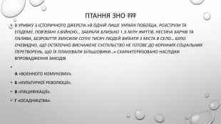 Птання зно ???В уривку з історичного джерела «В одній лише Україні побоїща, розстріли та епідемії, пов'язані з війною.., забрали близько 1,5 млн життів. Нестача харчів та палива, безробіття змусили сотні тисяч людей виїхати з міста в село... Було очевидно, що остаточно виснажене суспільство не готове до корінних соціальних перетворень, що їх планували більшовики...» схарактеризовано наслідки впровадження заходів. А «воєнного комунізму». Б «культурної революції». В «пацифікації». Г «осадництва».