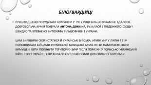 БілогвардійціПришвидшено побудувати комунізм у 1919 році більшовикам не вдалося. Добровольча армія генерала Антона Денікіна, рухалася з південного-сходу і швидко та впевнено витісняла більшовиків з України. Цим вирішили скористатися й українські війська. Армія УНР у липні 1919 поповнилася бійцями Української галицької армії. Як ви пам'ятаєте, вони вимушені були покинути територію ЗУНР після поразки у польсько-українській війні. Тепер українці спробували об'єднати сили для спільної боротьби.