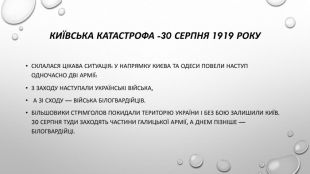 Київська катастрофа -30 серпня 1919 року. Склалася цікава ситуація: у напрямку Києва та Одеси повели наступ одночасно дві армії: з заходу наступали українські війська, а зі сходу — війська білогвардійців. Більшовики стрімголов покидали територію України і без бою залишили Київ. 30 серпня туди заходять частини галицької армії, а днем пізніше — білогвардійці.