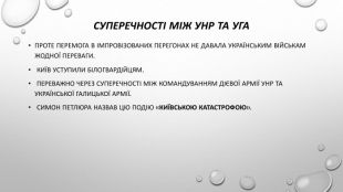 Суперечності між унр та уга. Проте перемога в імпровізованих перегонах не давала українським військам жодної переваги. Київ уступили білогвардійцям. Переважно через суперечності між командуванням Дієвої армії УНР та Української галицької армії. Симон Петлюра назвав цю подію «київською катастрофою».
