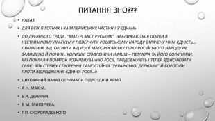 Питання ЗНО???НАКАЗДЛЯ ВСІХ ПІХОТНИХ І КАВАЛЕРІЙСЬКИХ ЧАСТИН І З’ЄДНАНЬДо древнього града, “матері міст руських”, наближаються полки в нестримному прагненні повернути російському народу втрачену ним єдність... Прагнення відторгнути від Росії малоросійську гілку російського народу не залишено й понині. Колишні ставленики німців – Петлюра та його соратники, які поклали початок розчленуванню Росії, продовжують і тепер здійснювати свою злу справу створення самостійної “Української Держави” й боротьби проти відродження Єдиної Росії...»Цитований наказ отримали підрозділи арміїА Н. Махна. Б А. Денікіна. В М. Григор’єва. Г П. Скоропадського