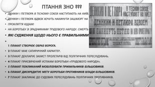 Птання зно ???Денікін і Петлюра в тісному союзі наступають на Київ. Денікін і Петлюра вдвох хочуть накинути зашморг на шию пролетаріату. Прокляття юдам!На боротьбу зі зрадниками трудового народу. Смерть катам!Які судження щодо нього є правильними?1 Плакат створює образ ворога.2 Плакат має сатиричний характер.3 Плакат декларує захист пролетарів від політичних переслідувань.4 Плакат присвячений успіхам боротьби «трудового народу».5 Плакат покликаний мобілізувати прихильників більшовиків.6 Плакат дискредитує мету боротьби противників влади більшовиків.7 Плакат закликає до судових переслідувань політичних противників.