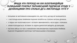 Зрада уга перехід на бік білогвардійцівгалицький генерал тарнавський підписав угоду з денікінцями про спільні дії 6 листопада 1919 р. Першими не витримали командири УГА, або того, що від неї залишилося. 1 листопада вони прийняли рішення перейти на сторону Антона Денікіна. У рядах УНР розпочався бунт. Петлюру звинувачують у всіх бідах і поразках. Армія розпадається. Петлюра та лідери Директорії виїздять до Варшави. Частина військ на чолі з Михайлом Омеляновичем-Павленком приймає рішення продовжити боротьбу партизанськими способами.