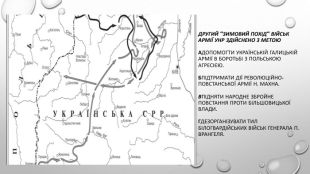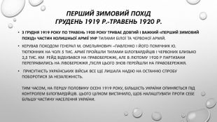Перший зимовий похід грудень 1919 р.-травень 1920 р. З грудня 1919 року по травень 1920 року триває довгий і важкий «Перший зимовий похід» частин колишньої армії УНР тилами Білої та Червоної армій. Керував походом генерал М. Омельянович –павленко і його помічник Ю. Тютюнник на чолі 5 тис. армії пройшли тилами білогвардійців і червоних близько 2,5 тис. км Рейд відбувався на правобережжі, але в лютому 1920 р партизани переправились на лівобережжя ,після цього знов перейшли на правобережжя. Присутність українських військ все ще лишала надію на останню спробу поборотися за незалежність. Тим часом, на першу половину осені 1919 року, більшість України опиняється під контролем білогвардійців. Цього цілком вистачило, щоб налаштувати проти себе більшу частину населення України.