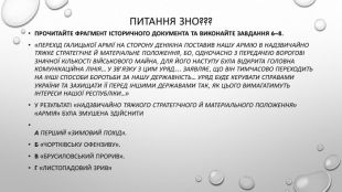 Питання зно???Прочитайте фрагмент історичного документа та виконайте завдання 6–8.«Перехід Галицької Армії на сторону Денікіна поставив нашу Армію в надзвичайно тяжке стратегічне й матеріальне положення, бо, одночасно з передачею ворогові значної кількості військового майна, для його наступу була відкрита головна комунікаційна лінія... У зв’язку з цим Уряд… заявляє, що він тимчасово переходить на інші способи боротьби за нашу державність... Уряд буде керувати справами України та захищати її перед іншими державами так, як цього вимагатимуть інтереси нашої республіки...»У результаті «надзвичайно тяжкого стратегічного й матеріального положення» «Армія» була змушена здійснити. А Перший «Зимовий похід». Б «Чортківську офензиву». В «Брусиловський прорив». Г «Листопадовий зрив»