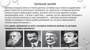 Питання зно???«Перехід Галицької Армії на сторону Денікіна поставив нашу Армію в надзвичайно тяжке стратегічне й матеріальне положення, бо, одночасно з передачею ворогові значної кількості військового майна, для його наступу була відкрита головна комунікаційна лінія... У зв’язку з цим Уряд… заявляє, що він тимчасово переходить на інші способи боротьби за нашу державність... Уряд буде керувати справами України та захищати її перед іншими державами так, як цього вимагатимуть інтереси нашої республіки...»Хто з діячів, зображених на фото, очолював Українську державу за обставин, наведених в уривку документа?