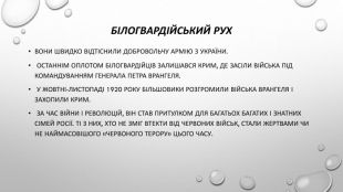 Білогвардійський рух. Вони швидко відтіснили Добровольчу армію з України. Останнім оплотом білогвардійців залишався Крим, де засіли війська під командуванням генерала Петра Врангеля. У жовтні-листопаді 1920 року більшовики розгромили війська Врангеля і захопили Крим. За час війни і революцій, він став притулком для багатьох багатих і знатних сімей Росії. Ті з них, хто не зміг втекти від червоних військ, стали жертвами чи не наймасовішого «червоного терору» цього часу.
