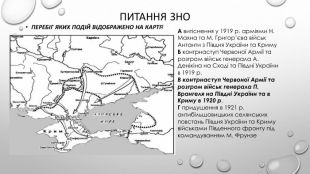 Питання зно Перебіг яких подій відображено на карті?А витіснення у 1919 р. арміями Н. Махна та М. Григор’єва військ Антанти з Півдня України та Криму. Б контрнаступ Червоної Армії та розгром військ генерала А. Денікіна на Сході та Півдні України в 1919 р. В контрнаступ Червоної Армії та розгром військ генерала П. Врангеля на Півдні України та в Криму в 1920 р. Г придушення в 1921 р. антибільшовицьких селянських повстань Півдня України та Криму військами Південного фронту під командуванням М. Фрунзе
