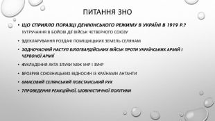 Питання зно. Що сприяло поразці денікінського режиму в Україні в 1919 р.?1утручання в бойові дії військ Четверного союзу2декларування роздачі поміщицьких земель селянам3одночасний наступ білогвардійських військ проти українських армій і Червоної Армії4укладення Акта Злуки між УНР і ЗУНР5розрив союзницьких відносин із країнами Антанти6масовий селянський повстанський рух7проведення реакційної, шовіністичної політики