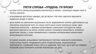 Третя спроба –грудень 1919року. Це була третя спроба більшовиків закріпитися в Україні. І попередні невдачі таки їх чогось навчили. Більшовикам достатньо швидко, ще до весни 1920 року, вдалося відновити радянську владу в Україні. Вони взяли на озброєння національні гасла. Відвоювання України здійснювали під прапором незалежної УСРР. Усі члени партії мали знати українську мову. Ідею створення колгоспів — великих колективних селянських господарств також вирішили відкласти на потім. Селяни нарешті отримали можливість отримати додаткову землю, а тому примирилися з іншими неприємними моментами більшовицької політики. В усьому іншому, більшовики підтримували політику «воєнного комунізму». Тільки більш рішуче. Продовжила діяти продрозкладка, націоналізація підприємств і «червоний терор» ніхто не відміняв. Тим паче, що в цей час з'явився реальний шанс порушити «світову революцію» ще далі.