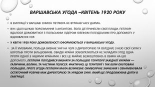 Варшавська угода –квітень 1920 року. В еміграції у Варшаві Симон Петлюра не втрачав часу дарма. Він і далі шукав порозуміння з Антантою. Його дії принесли свої плоди. Петлюрі вдалося домовитися з польським лідером Юзефом Пілсудським про допомогу у відновленні УНР. У квітні 1920 року домовленості оформюються у Варшавську угоду. За її умовами, Польща визнає УНР на чолі з Директорією та об'єднує з нею свої сили у боротьбі проти більшовиків. Обидві країни зобов'язуються не укладати угод одна проти одної з іншими країнами. І все це майже безкоштовно: в обмін на цю допомогу, Петлюра погодився визнати за Польщею території Західної України — Галичини, Волині, та частини Полісся. Фактично, ці території і так були окуповані Польщею, проте згода Петлюри мала величезне символічне значення і ознаменувала остаточний розрив між Директорією та урядом ЗУНР, який ще продовжував діяти в еміграції.