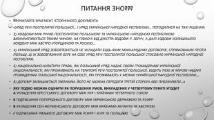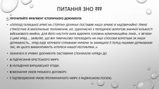 Питання зно???Прочитайте фрагмент історичного документа «Уряд Речі Посполитої Польської... і уряд Української Народної Республіки... погодилися на такі рішення:2) Кордони між Річчю Посполитою Польською та Українською Народною Республікою визначатимуться таким чином: на півночі від Дністра вздовж р. Збруч, а далі уздовж колишнього кордону між Австро-Угорщиною та Росією...4) Український уряд зобов'язується не укладати будь-яких міжнародних договорів, спрямованих проти Польщі. Ці ж зобов’язання бере на себе уряд Речі Посполитої Польської стосовно Української Народної Республіки.5) Національно-культурні права, які польський уряд надає своїм громадянам української національності, які проживають на території Речі Посполитої Польської, будуть тією ж мірою надані громадянам польської національності, які проживають у межах Української Народної Республіки....8) Договір залишається таємним. Його не можна передати третій стороні або публікувати...»Яку подію можна оцінити як порушення умов, викладених у четвертому пункті угоди?А укладення Брестського договору між УНР і країнами Четверного союзу. Б підписання попереднього договору між Українською Державою та РСФРРВ укладення Сен-Жерменського договору між країнами Антанти та Австрією. Г підписання Ризького договору між РСФРР і УСРР та Польщею
