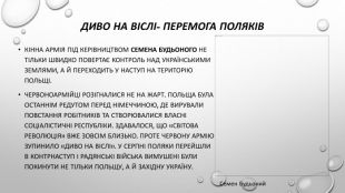 Диво на віслі- перемога поляків. Кінна армія під керівництвом Семена Будьоного не тільки швидко повертає контроль над українськими землями, а й переходить у наступ на територію Польщі. Червоноармійці розігналися не на жарт. Польща була останнім редутом перед Німеччиною, де вирували повстання робітників та створювалися власні соціалістичні республіки. Здавалося, що «світова революція» вже зовсім близько. Проте Червону армію зупинило «диво на Віслі». У серпні поляки перейшли в контрнаступ і радянські війська вимушені були покинути не тільки Польщу, а й Західну Україну. Семен Будьоний