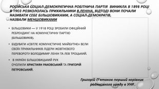 Російська Соціал-Демократична Робітнича Партія виникла в 1898 роців 1903 розкололась прихильники В. Леніна, Відтоді вони почали називати себе більшовиками, а соціал-демократів, назвали меншовиками. Більшовики — у 1918 році зробили офіційний ребрендинг на Комуністичну партію (більшовиків). Будувати «світле комуністичне майбутнє» вели своїх прихильників лідери Жовтневого перевороту Володимир Ленін та Лев Троцький. В Україні більшовицький рух очолили Християн Раковський та Григорій Петровський. Григорій П’ятаков перший керівник радянського уряду в УНР