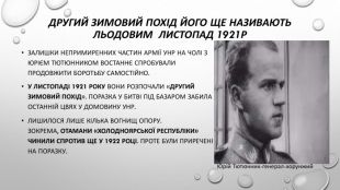 Другий зимовий похід його ще називають льодовим листопад 1921р. Залишки непримиренних частин армії УНР на чолі з Юрієм Тютюнником востаннє спробували продовжити боротьбу самостійно. У листопаді 1921 року вони розпочали «Другий зимовий похід». Поразка у битві під Базаром забила останній цвях у домовину УНР. Лишилося лише кілька вогнищ опору. Зокрема, отамани «Холодноярської республіки» чинили спротив ще у 1922 році. Проте були приречені на поразку. Юрій Тютюнник-генерал-хорунжий