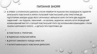 Питання зно???В уривку з історичного джерела «Після прийняття рішення про необхідність підняття загального повстання в Україні польовий повстанський штаб приступив до підготовчих заходів щодо його організації. Вирішено було пустити два відділи: південний – на Поділля, північний – на Волинь. Водночас мусить бути проведений комбінований виступ у Першій повстанській групі під керуванням командира І групи генерал-хорунжого Гулого…» ідеться про підготовку до. А повстання Н. Григор’єва. Б радянсько-польської війни. В Другого Зимового походу Армії УНР. Г антигетьманського повстання Директорії.