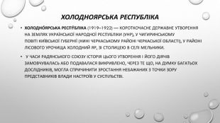 Холодноярська республіка. Холодно́ярська Респýбліка (1919–1922) — короткочасне державне утворення на землях Української Народної Республіки (УНР), у Чигиринському повіті Київської губернії (нині Черкаському районі Черкаської області), у районі лісового урочища Холодний Яр, зі столицею в селі Мельники. У часи Радянського Союзу історія цього утворення і його діячів замовчувалась або подавалася викривлено, через те що, на думку багатьох дослідників, могла спричинити зростання небажаних з точки зору представників влади настроїв у суспільстві.