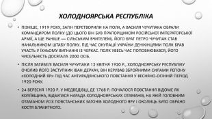Холодноярська республіка. Пізніше, 1919 року, загін перетворили на полк, а Василя Чучупака обрали командиром полку (до цього він був прапорщиком Російської Імператорської армії, а ще раніше — сільським вчителем). Його брат Петро Чучупак став начальником штабу полку. Під час окупації України денікінцями полк брав участь у їхньому вигнанні із Черкас. Полк увесь час поповнювався, його чисельність досягала 2000 осіб. Після загибелі Василя Чучупаки 12 квітня 1920 р., Холодноярську республіку очолив його заступник Іван Деркач, він керував збройними силами регіону «Холодний Яр» під час антирадянського повстання у весняно-осінній період 1920 року.24 вересня 1920 р. у Медведівці, де 1768 р. почалося повстання відоме як Коліївщина, відбулася нарада холодноярських отаманів, на якій Головним отаманом усіх повстанських загонів Холодного Яру і околиць було обрано Костя Блакитного.