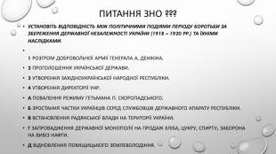 Питання зно ???Установіть відповідність між політичними подіями періоду боротьби за збереження державної незалежності України (1918 – 1920 рр.) та їхніми наслідками.1 Розгром Добровольчої армії генерала А. Денікіна.2 Проголошення Української Держави.3 Утворення Західноукраїнської Народної Республіки.4 Утворення Директорії УНР. А Повалення режиму гетьмана П. Скоропадського. Б Зростання частки українців серед службовців державного апарату республіки. В Встановлення радянської влади на території України. Г Запровадження державної монополії на продаж хліба, цукру, спирту; заборона на вивіз нафти. Д Відновлення поміщицького землеволодіння.
