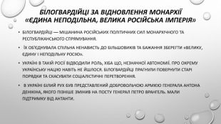 Білогвардійці за відновлення монархії «Єдина неподільна, велика російська імперія»Білогвардійці — мішанина російських політичних сил монархічного та республіканського спрямування. Їх об'єднувала спільна ненависть до більшовиків та бажання зберегти «Велику, єдину і неподільну Росію». Україні в такій Росії відводили роль, хіба що, незначної автономії. Про окрему українську націю навіть не йшлося. Білогвардійці прагнули повернути старі порядки та скасувати соціалістичні перетворення. В Україні білий рух був представлений Добровольчою армією генерала Антона Денікіна, якого пізніше змінив на посту генерал Петро Врангель. Мали підтримку від Антанти.