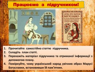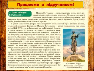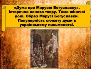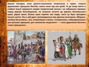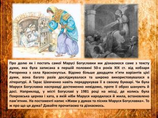 Історична довідка про напад турків на Україну У ХV–ХVІІ ст. турки і татари часто нападали на українські села та міста, грабували й палили їх. Старих людей та маленьких діток вони вбивали, а молодь забирали у полон і потім продавали в рабство. Український народ героїчно боровся з поневолювачами. Особливо уславилися своєю мужністю козаки. Щоб попередити збройні напади ворога, вони нерідко перепливали Чорне море на кораблях (галерах) та великих човнах («чайках»). Досягнувши берегів Туреччини, палили її столицю Царгород, громили військо, знищували флот, розбивали в’язниці і визволяли полонених. Бувало, що хтось із козаків-месників сам потрапляв у полон до турків. Полоненим козакам татарські і турецькі ватажки нерідко пропанували стати до них на службу, обіцяючи за це багатство і владу. Але мужні запорожці воліли краще вмерти від жорстоких тортур, аніж продатися ворогові. Зрада Батьківщини ганебна, а ганьба для козака була страшніша за катування й смерть. Ця тема знайшла своє відображення і в «Думі про Марусю Богуславку».