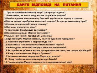 1. Про які часи йдеться мова у творі? Що про це свідчить?2. Яким чином, на ваш погляд, козаки потрапили у полон?3. Назвіть відомих вам ватажків у боротьбі українського народу з турками.4. В яких умовах перебували запорожці у полоні? Як про це зазначено у думі? 5. Скільки козаків перебувало в темниці?6. Яке море згадується у творі?7. З якого роду була Маруся Богуславка?8. Як козаки називали Марусю Богуславку?9. Скільки часу козаки перебували у в'язниці?10. Що пообіцяла Маруся козакам, коли не буде пана турецького?11. Як козаки сприйняли її звернення до них? 12. Назва міста, в якому живуть батьки головної героїні?13. Напередодні якого свята Маруся випускає невільників?14. Як сприйняли ув’язнені козаки про християнське свято, яке почули від Марусі? 15. Чому козаки називали Марусю бранкою?16. З яким проханням звернулася Маруся до козаків? 17. Чому героїня не хоче повернутися до батьків? 18. Чи мала права Маруся відмовлятися від християнської віри?ДАЙТЕ ВІДПОВІДІ НА ПИТАННЯ