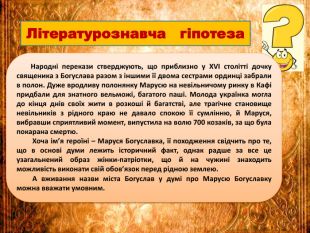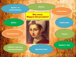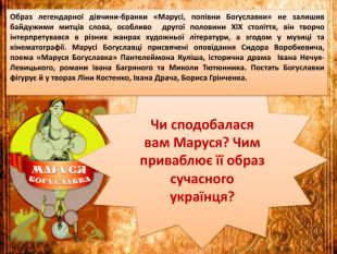 Чи сподобалася вам Маруся? Чим приваблює її образ сучасного українця?Образ легендарної дівчини-бранки «Марусі, попівни Богуславки» не залишив байдужими митців слова, особливо другої половини ХІХ століття, він творчо інтерпретувався в різних жанрах художньої літератури, а згодом у музиці та кінематографії. Марусі Богуславці присвячені оповідання Сидора Воробкевича, поема «Маруся Богуславка» Пантелеймона Куліша, історична драма Івана Нечуя-Левицького, романи Івана Багряного та Миколи Тютюнника. Постать Богуславки фігурує й у творах Ліни Костенко, Івана Драча, Бориса Грінченка.