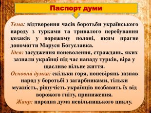 Тема: відтворення часів боротьби українського народу з турками та тривалого перебування козаків у ворожому полоні, яким прагне допомогти Маруся Богуславка.Ідея: засудження поневолення, страждань, яких зазнали українці під час нападу турків, віра у щасливе вільне життя. Основна думка: скільки горя, поневірянь зазнав народ у боротьбі з загарбниками, тільки мужність, рішучість українців позбавить їх від ворожого гніту, приниження. Жанр: народна дума невільницького циклу. Паспорт думи