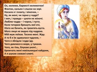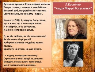 Л. Костенко “Чадра Марусі Богуславки”Вузенька вуличка. Стіна, повита хмелем. Татари сплять, сьогодні в них байрам. Високий дуб, по-українськи - нелинь. Святе письмо, по-їхньому - Коран. Чого я тут? Ще й, кажуть, Богу слава, що я жива, що в мене муж паша. А я- Маруся. Я- із Богуслава. У мене є непродана душа. О, як він любить, як він мене палить!Як він мене цілує уночі!Каблучки нанизав по дві на кожен палець. Браслети на руках, на шиї дукачі.І я ходжу, володарка темниці. Скриплять у тиші двері за дверми. Блищать очима слуги темнолиці, мені у ноги стелять килими.