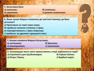 5. Богуславка була:а) козачкою; б) попівною;в) царевною; г) дочкою селянською.6. Яким чином Маруся потрапила до кам’яної темниці, де були ув’язнені?а) Припливла на човні через море;б) пройшла таємною стежкою у горах;в) переодягнувшись у турка охоронця;г) пройшла, як дружина турецького пана.7. Козаки називали Марусю Богуславку:а) султаншею; б) бранкою;в) винахідливою; г) панночкою.8. Напередодні якого свята православних у творі відбуваються події?а) Сорокового дня від Великодня; б) Сорока Святих;в) Петра і Павла; г) Вербної неділі.