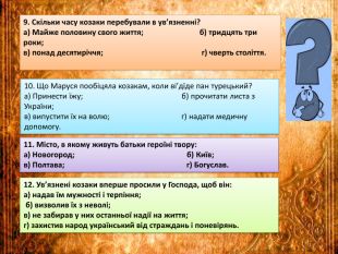 9. Скільки часу козаки перебували в ув’язненні?а) Майже половину свого життя; б) тридцять три роки;в) понад десятиріччя; г) чверть століття.10. Що Маруся пообіцяла козакам, коли ві’дїде пан турецький?а) Принести їжу; б) прочитати листа з України;в) випустити їх на волю; г) надати медичну допомогу.11. Місто, в якому живуть батьки героїні твору:а) Новогород; б) Київ;в) Полтава; г) Богуслав.12. Ув’язнені козаки вперше просили у Господа, щоб він:а) надав їм мужності і терпіння; б) визволив їх з неволі;в) не забирав у них останньої надії на життя;г) захистив народ український від страждань і поневірянь.