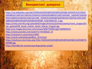 Використані джерелаhttps://uk.wikipedia.org/wiki/%D0%A4%D0%B0%D0%B9%D0%BB:%D0%9 C%D1%83%D0%BB%D1%8 C%D1%82%D1%84%D1%96%D0%BB%D1%8 C%D0%BC_%D0%9 C%D0%B0%D1%80%D1%83%D1%81%D1%8 F_%D0%91%D0%BE%D0%B3%D1%83%D1%81%D0%BB%D0%B0%D0%B2%D0%BA%D0%B0_%281966%29_2.jpghttps://mala.storinka.org/uploaded/images/Articles/portrety/poety/maria_prygara/kozak_golota/039_Kozak_Holota_zbirka_Marija_Prygara.jpghttps://ua-images.kinorium.com/movie/300/733499.jpg?1609604431https://www.youtube.com/watch?v=Yvm6dta. O_DIhttps://ukrland.in.ua/archives/3961https://ukrlit.net/textbook/8klas_3/19.htmlhttps://edufuture.biz/index.php?title=%D0%A4%D0%B0%D0%B9%D0%BB:%D0%9 B7%D0%B0.jpghttps://dovidka.biz.ua/marusya-boguslavka-analiz/