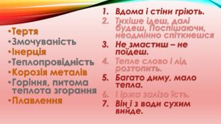 Тертя. ЗмочуваністьІнерція. Теплопровідність. Корозія металів. Горіння, питома теплота згорання. Плавлення. Вдома і стіни гріють. Тихіше ідеш, далі будеш. Поспішаючи, неодмінно спіткнешся. Не змастиш – не поїдеш. Тепле слово і лід розтопить. Багато диму, мало тепла.І іржа залізо їсть. Він і з води сухим вийде.