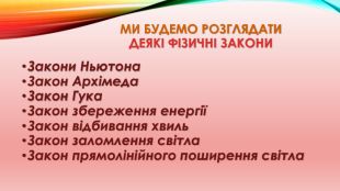 ми будемо розглядати Деякі фізичні закони Закони Ньютона. Закон Архімеда. Закон Гука. Закон збереження енергіїЗакон відбивання хвиль. Закон заломлення світла. Закон прямолінійного поширення світла