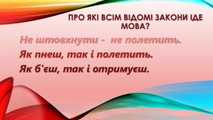 Про які всім відомі закони іде мова?Не штовхнути - не полетить. Як пнеш, так і полетить. Як б'єш, так і отримуєш.