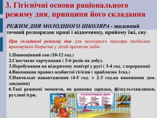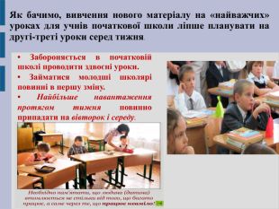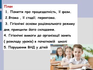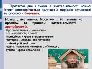 Презентація добре ілюструє і формує краще уявлення про особливості біоритмів у дитячому організмі та врахуванні закономірностей у діяльності ВНД дітей про складанні режиму дня школярів та гігієнічним особливостям при створенні розкладу уроків , особливо у початковій школі. Показано основні порушення ВНД у дітей та причини їх виникнення.