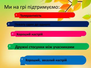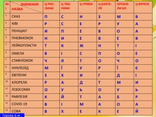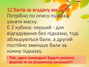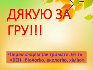 Презентація гри для 6-8 класів до тижня з біології, екології та хімії включає в себе іноваційні,інтерактивні, круті, сучасні завдання: визнач за описом-підказками тваринку, рослинку; вгадай по жестам та позам природничий об'єкт; хімічне диво; розшифруй криптограму прочитай вислів біологічний та друге завдання прочитай хімічне правило; розшифруй ребус; знайди хто під чорною маскою. А самі завдання можна використовувати окремо на різних етапах уроку , на різних уроках та у різних класах.