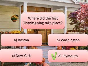 Where did the first Thanksgiving take place?a) Bostonc) New Yorkb) Washingtond) Plymouth√