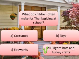 What do children often make for Thanksgiving at school?a) Costumesc) Fireworksb) Toysd) Pilgrim hats and turkey crafts√