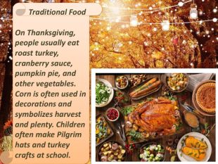 Traditional Food. On Thanksgiving, people usually eat roast turkey, cranberry sauce, pumpkin pie, and other vegetables. Corn is often used in decorations and symbolizes harvest and plenty. Children often make Pilgrim hats and turkey crafts at school.