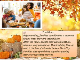 Traditions. Before eating, families usually take a moment to say what they are thankful for. After the meal, people may watch football, which is very popular on Thanksgiving Day, or watch the Macy’s Parade in New York City. Families also spend time together playing games or watching movies.