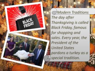 Modern Traditions. The day after Thanksgiving is called Black Friday, famous for shopping and sales. Every year, the President of the United States pardons a turkey as a special tradition.