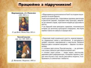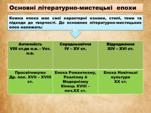 Кожна епоха має свої характерні ознаки, стилі, теми та підходи до творчості. До основних літературно-мистецьких епох належать: Основні літературно-мистецькі епохи {F5 AB1 C69-6 EDB-4 FF4-983 F-18 BD219 EF322}Античність. VIII ст.до н.е. - Vст. н.е. СередньовіччяІV – ХV ст. Відродження ХІV – ХVІ ст. Просвітництво. Др. пол. ХVІІ – ХVІІІ ст. Епоха Романтизму, Реалізму й Модернізму. Кінець ХVІІІ – поч. ХХ ст. Епоха Новітньої культури. ХХ ст.