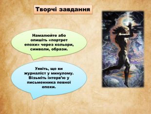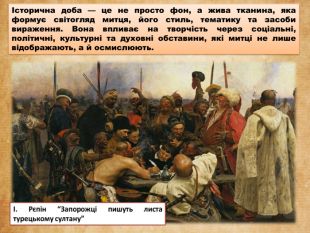 Митець — людина свого часу, яка через творчість реагує на виклики, шукає сенси, формує нові естетичні цінності. Його твори можуть бути як дзеркалом епохи, так і протестом проти неї. Творчість митця — це діалог із часом. Вона може бути голосом покоління, пророчим баченням майбутнього або інтимним щоденником душі в історичному контексті. На прикладі одного з раніше прочитаних творів покажіть вплив історичної епохи на митця. Особистісний вплив доби