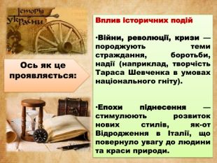 Вплив історичних подій. Війни, революції, кризи — породжують теми страждання, боротьби, надії (наприклад, творчість Тараса Шевченка в умовах національного гніту). Епохи піднесення — стимулюють розвиток нових стилів, як-от Відродження в Італії, що повернуло увагу до людини та краси природи. Ось як це проявляється: