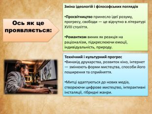Зміна ідеологій і філософських поглядів. Просвітництво принесло ідеї розуму, прогресу, свободи — це відчутно в літературі XVIII століття. Романтизм виник як реакція на раціоналізм, підкреслюючи емоції, індивідуальність, природу. Технічний і культурний прогрес. Винахід друкарства, розвиток кіно, інтернет — змінюють форми мистецтва, способи його поширення та сприйняття. Митці адаптуються до нових медіа, створюючи цифрове мистецтво, інтерактивні інсталяції, гібридні жанри. Ось як це проявляється: