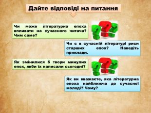 Дайте відповіді на питання. Чи може літературна епоха впливати на сучасного читача? Чим саме?Чи є в сучасній літературі риси старших епох? Наведіть приклади. Як змінилися б твори минулих епох, якби їх написали сьогодні?Як ви вважаєте, яка літературна епоха найближча до сучасної молоді? Чому?