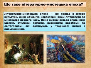 Літературно-мистецька епоха — це період в історії культури, який об'єднує характерні риси літератури та мистецтва певного часу. Вона визначається спільними ідеями, стилями, темами, художніми засобами та світоглядом, які домінують у творчості митців і письменників. Що таке літературно-мистецька епоха?