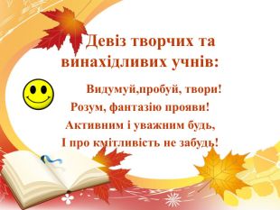 Девіз творчих та винахідливих учнів: Видумуй,пробуй, твори!Розум, фантазію прояви!Активним і уважним будь, І про кмітливість не забудь!
